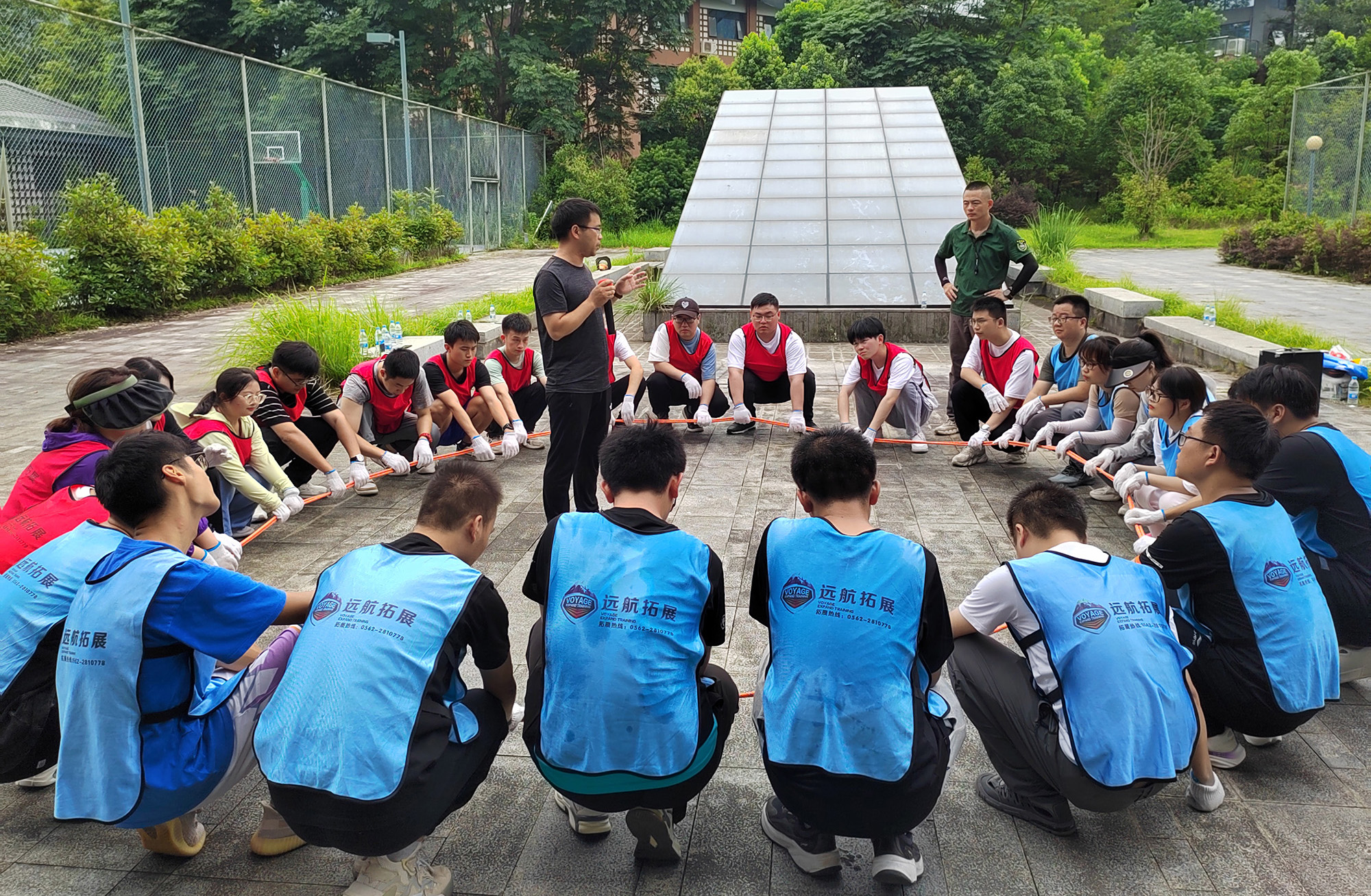 拓展培訓(xùn)活動(dòng)在教練的專業(yè)指導(dǎo)下有序進(jìn)行:新入職大學(xué)生分為2個(gè)小組,由組長(zhǎng)牽頭合作創(chuàng)建了屬于自己的團(tuán)隊(duì),為各自的團(tuán)隊(duì)設(shè)計(jì)隊(duì)名、隊(duì)歌、隊(duì)旗及口號(hào),并共同完成瘋狂市場(chǎng)、急速60秒、雙解碼及生命動(dòng)力圈等一系列活動(dòng)。