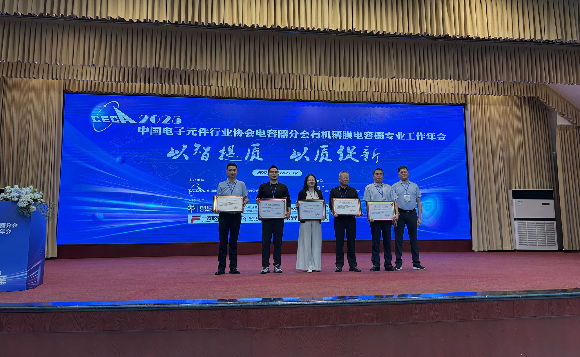 10月14日至17日,中國電子元件行業(yè)協(xié)會電容器分會有機(jī)專業(yè)2025年工作年會在四川瀘州成功舉辦。中電元協(xié)常務(wù)理事、電容器分會第九屆副理事長、公司總經(jīng)理鮑俊華代表公司出席并作主題交流報告。薄膜分公司獲評電容器分會2025年度“優(yōu)秀供應(yīng)商”榮譽稱號。